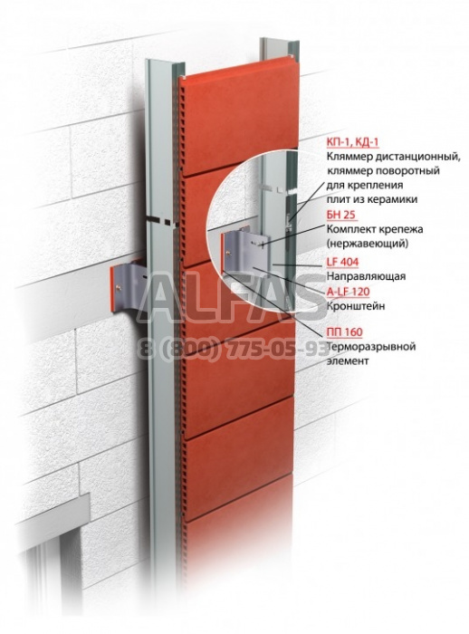 Гарантированный состав сплава всех несущих элементов системы - А 6063 Т6, обеспечиваемый диапазон регулировки относа от стены от 210 мм до 280мм. В качестве облицовки используются плиты из керамики. Крепление осуществляется открытым способом при помощи поворотного кляммера, изготовленного из нержавеющей стали 12Х18Н10Т.